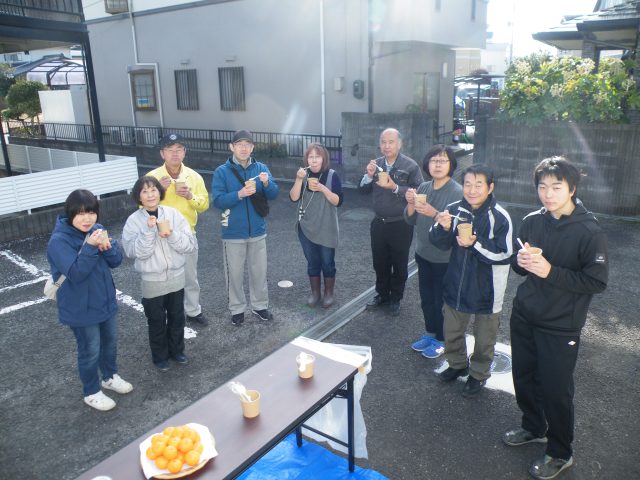 作業の後、ぜんざいをいただきながら、反省会を行いました。