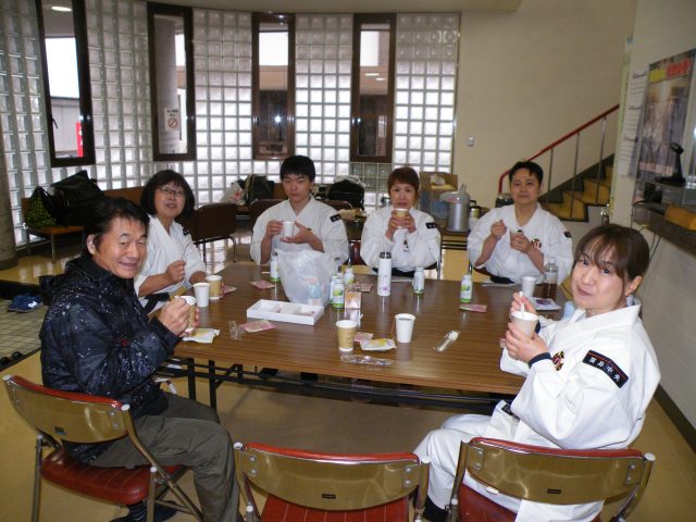 火は使えないので、湯銭方式でできるものを用意しました。ぜんざいをいただきながら、門信徒代表挨拶をしてくれた拳士の成長を称えたり、少林寺拳法愛を語り合いました。