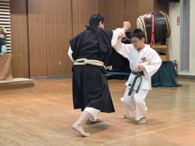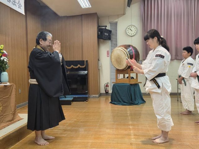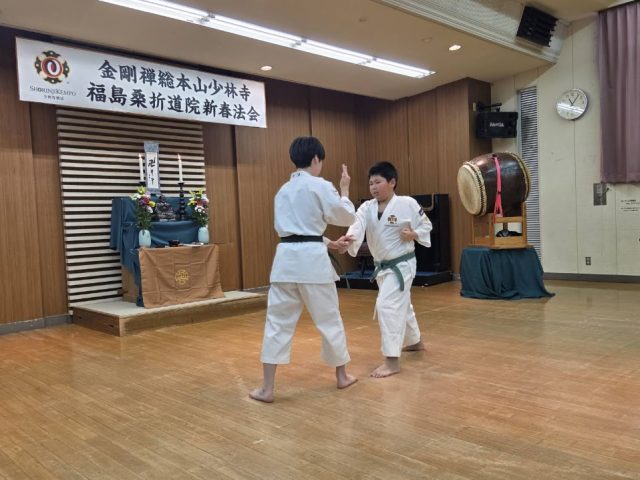 その後、全員での基本演練を行って今年の練習始めとし、奉納演舞は、岡拳士と竹井拳士が行い、団体演舞、少年部演舞、OB演舞、古希年代の三人掛け演舞を来賓の方々の前で披露しました。